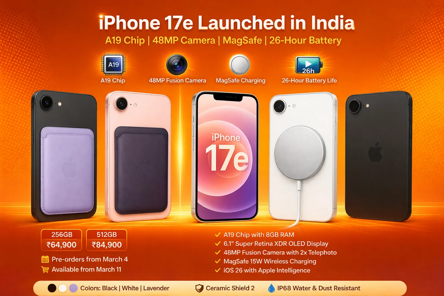 The iPhone 17e was launched in India at ₹64,900 for the 256GB variant. The 512GB variant is priced at ₹84,900. Pre-orders began on March 4 at 7:45 PM IST, and sales officially started from March 11 via Apple Store, Flipkart, Amazon, and offline retailers.